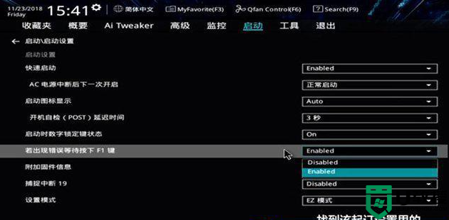 找到“若出现错误等待按下F1键”并选择下拉,我们修改为“Disabled”关闭状态。