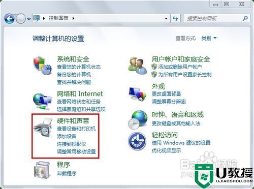 2、在控制面板中点击【硬件和声音】选项卡,这里可以对系统的各种硬件资源进行设置。