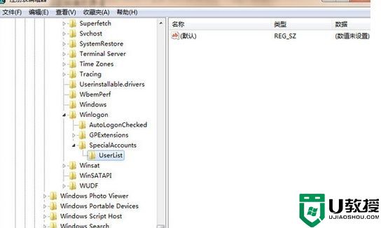 2、依次点击展开HKEY_LOCAL_MACHINESOFTWAREMicrosoftWindows NTCurrentVersionWinlogonSpecialAccountsUserList;
