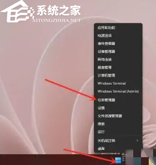 1、鼠标右键单击任务栏中的【开始】选项,然后在弹出的菜单中选中【任务管理器】,打开任务管理器。