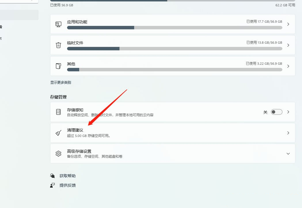 5、存储管理下,点击【清理建议】,等扫描完成后,进入清理建议。