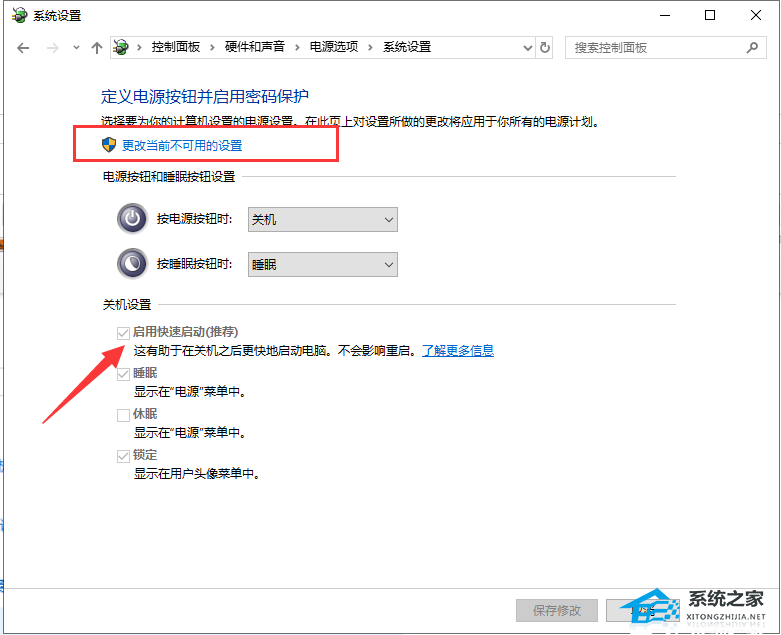 4. 点击更改当前不可用的设置,勾选下方的启动快速启动,点击保存修改按钮即可。
