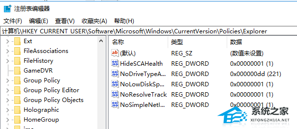 3. 找到HKEY_CURRENT_USER——Software——Microsoft——Windows——CurrentVersion——Policies——Explorer。