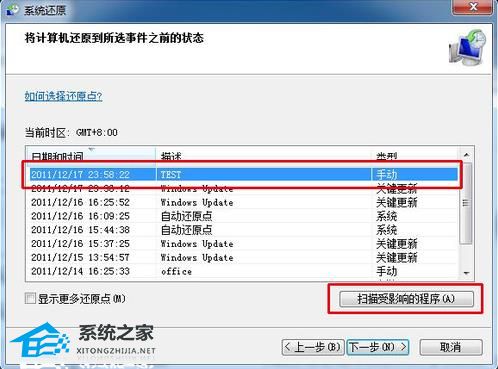 3、最后只要选择最近手动设置过的还原点以及其他自动的还原点都可以,但是最好下一步之前点击“扫描受影响的程序”按钮。如图所示: