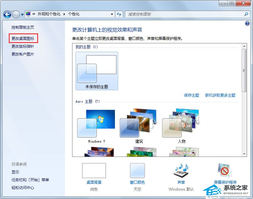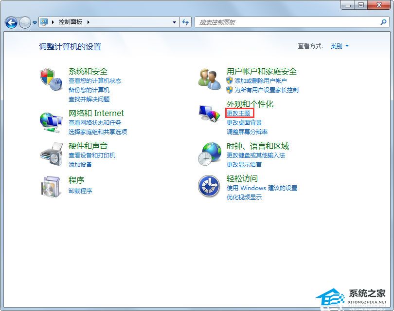 1、在控制面板上的外观和个性化中,选择更改主题;