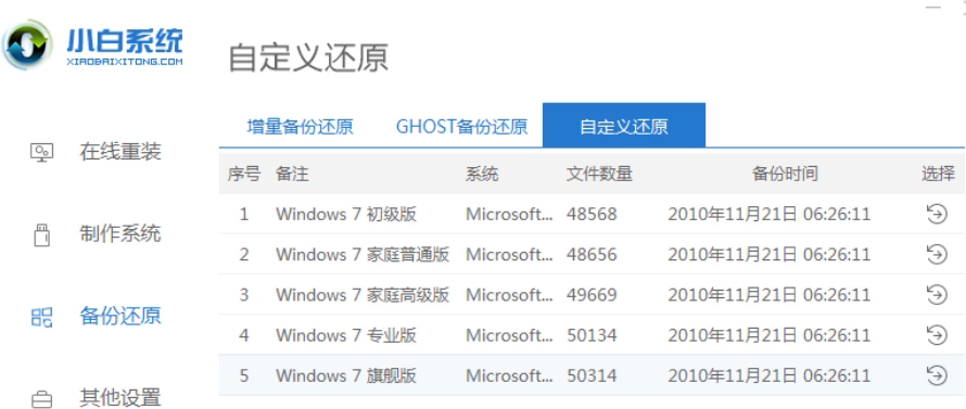 3、选择“备份还原”选项,选择“自定义还原”,可以搜到当前D盘下的Win 7镜像,选择之后点击“下一步”