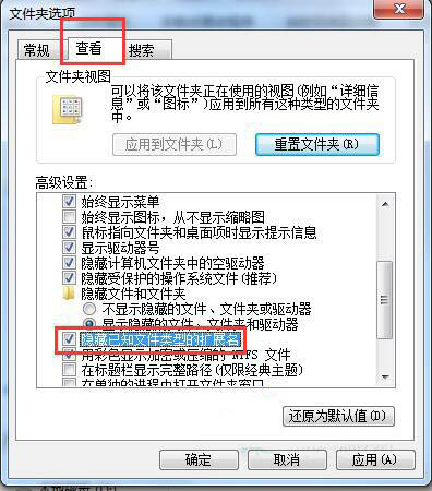 3、在高级设置中将滚动条拉到最底部,将“隐藏已知文件类型的扩展名”前面的勾去掉