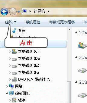 1、点击计算机,点击组织,选择“文件夹及搜索选项