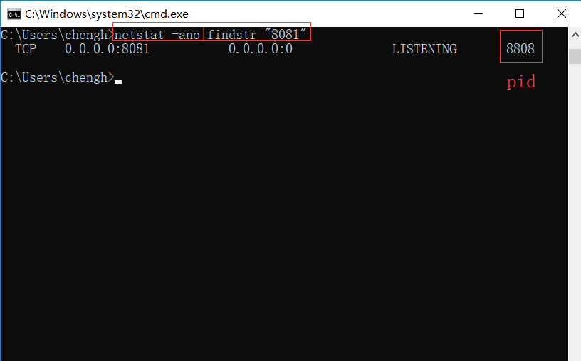 在这里我们就可以找到是谁在使用我的8081端口了,可以看到它的Pid为 8808;