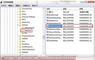 在注册表编辑器中依次点击HEY_CURRENT_USERSoftwareMicrosoftWindowsCurrentversionPoliciesExplorer,找到NoDriveTypeAutoRun值。