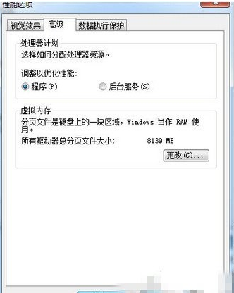 在性能选项中继续点击高级,点击虚拟内存中的更改。