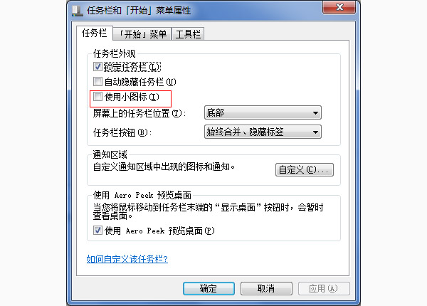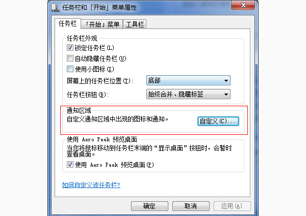 我们从任务栏和开始菜单属性对话框中就可以看出,除了设置任务栏图标大小外还可以根据自己的习惯去设置它,任务栏主要分了三部分可选项,任务栏外观,通知区域和使用Aero Peek预览桌面,这里也详细的讲一下各个选项的功能和作用。