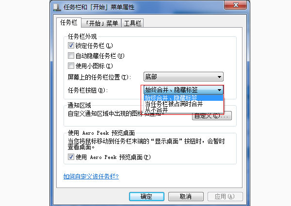 任务栏按钮:三个可选项始终合并、隐藏标签、当任务栏别占满时合并、从不合并