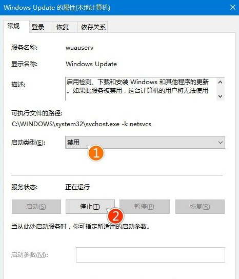 1、使用Win+R组合键打开运行,输入services.msc进入服务界面,并且找到Windows Update服务,右键点击它打开属性,将启动类型更改为禁用并且停止其的服务状态。