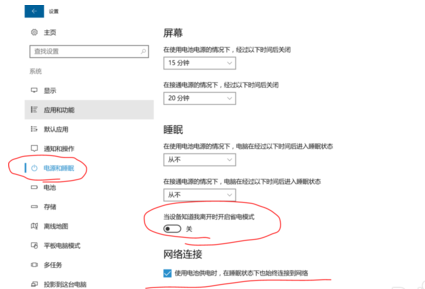 2、点击左侧的“电源和睡眠”选项卡,将“睡眠”一栏的“当设备知道我离开时开启省电模式”关闭即可。