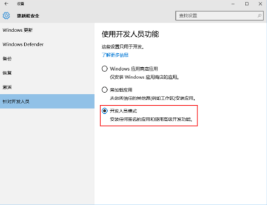 2、接着点击左侧“针对开发人员”,选择开发人员模式(怕个人数据泄露者慎用);