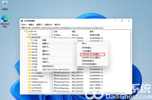 4、然后鼠标右键选择新建一个【DWORD值(32)】将其命名为TaskbarSi。