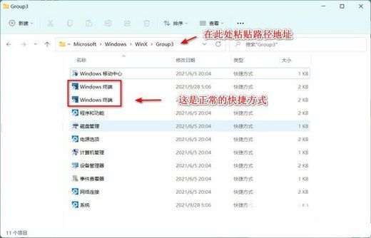 2、在文件资源管理器地址栏输入:%USERPROFILE%\AppData\Local\Microsoft\Windows\WinX\Group3,发现Group3文件夹windows终端、windows终端(管理员)两个快捷方式损坏;注释:Group3文件夹放的快捷方式是右键开始菜单部分功能的快捷方式。