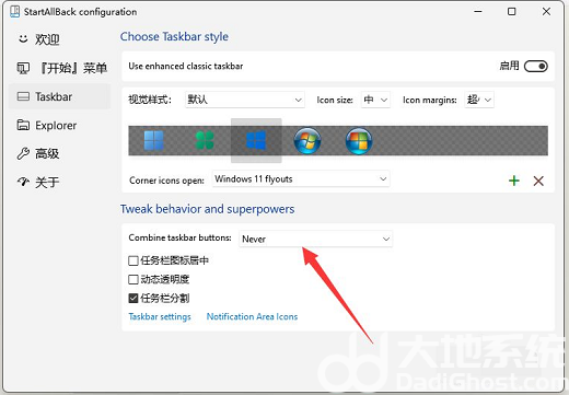 2、Combine taskbar buttons这一项选择Never,就是总是不合并,这样就可以将win11任务栏设置不合并了。