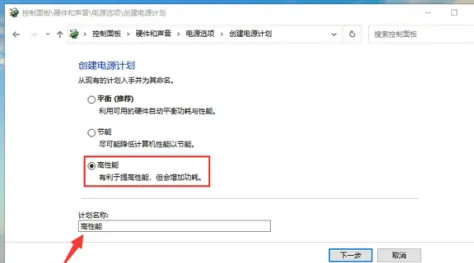 5、选择“高性能”,将计划名称也更改为高性能,点击下一步,根据提示完成创建即可