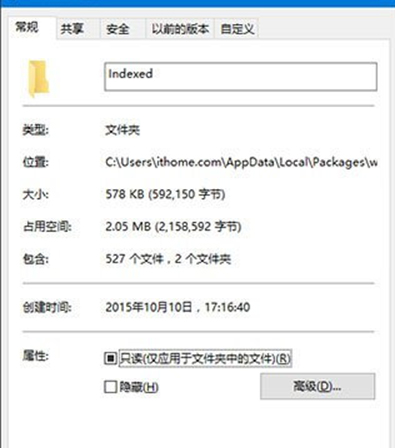2、右击Indexed之后点击【属性】,在属性界面选择【常规】在下方选择【高级】。