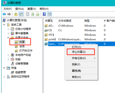 2、之后在新界面左侧选择文件共享之后在选择共享,然后右侧窗口就会出现共享的文件,之后右击共享文件,在下拉菜单中选择【停止共享】即可。