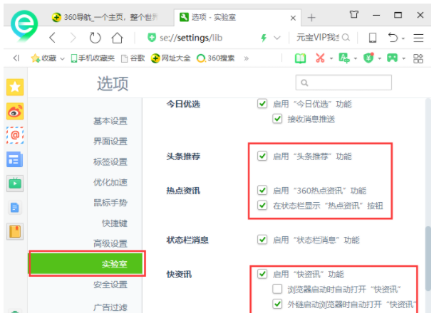 2、在浏览器的设置选项中,我们找到“实验室”菜单里面关闭资讯的勾选去掉。