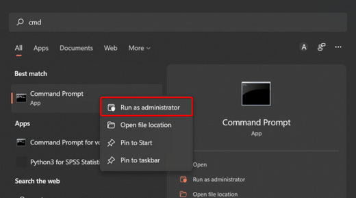 1、点击Windows键,输入cmd,右键单击第一个结果,选择Run as administrator