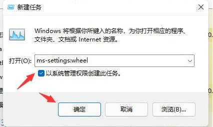 2.接着我们在该界面之中勾选“以系统管理权限创建此任务”,输入指令“ms-settings:wheel”,按下回车确认;