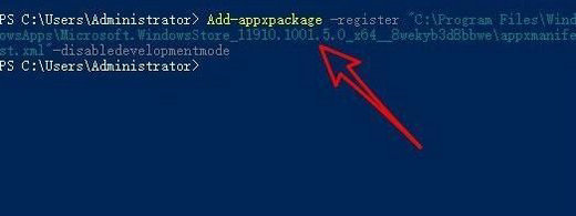 4、接下来在下面的窗口中输入以下指令: Add-appxpackage -register “C:\Program Files\WindowsApps\Microsoft.WindowsStore_11910.1001.5.0_x64__8wekyb3d8bbwe\appxmanifest. ”-disabledevelopmentmode, 注意我们需要将中间对应的值换成我们上面复制的详细数值。