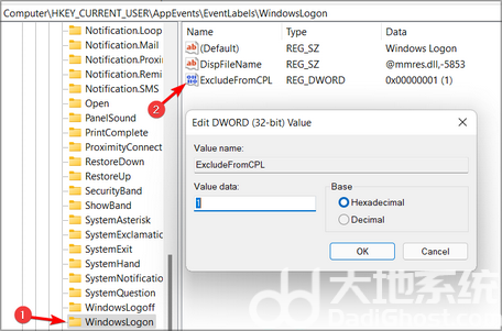 2、导航到以下键:HKEY_CURRENT_USER/AppEvents/EventLabels/WindowsLogon,双击ExcludeFromCPL DWORD