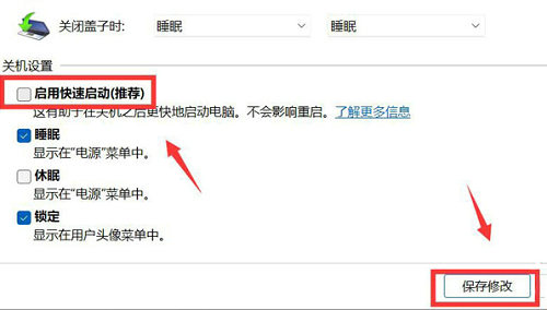 6、关机设置下,取消勾选启用快速启动(推荐),最后,点击保存修改即可