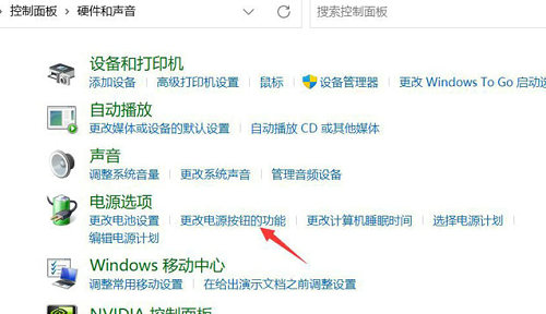 4、硬件和声音窗口,点击电源选项下的更改电源按钮的功能