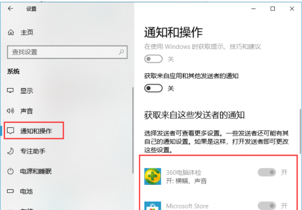 3、在系统设置界面的左侧,找到【通知操作】,然后检查一下是否将通知关闭了。
