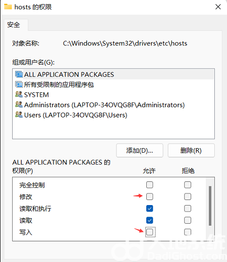 5、hosts 的权限窗口,勾选允许【修改】,以及【读取写入】;
