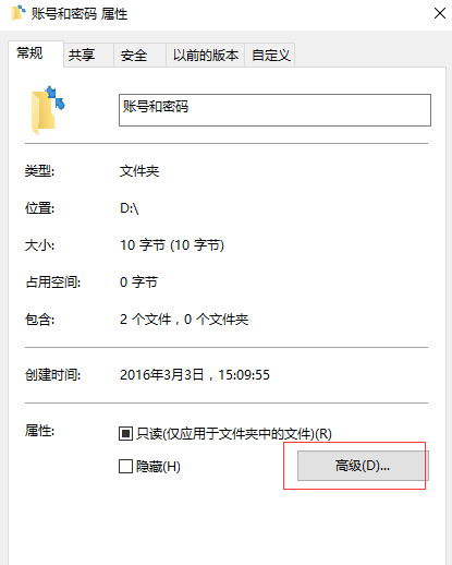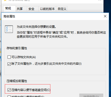 2、然后点击高级就会进入新的界面,在最下方我们会看到有一个【压缩内容以便节省磁盘空间】。