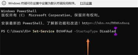 3、进入管理员执行窗口,输入指令“Set-Service BthHFAud -StartupType Disabled”回车即可修复,如下图所示