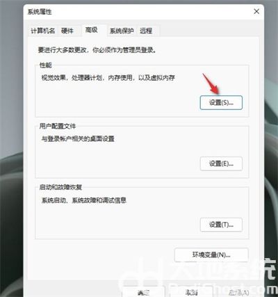 2.在高级面板,下点击性能视觉效果当中的设置。