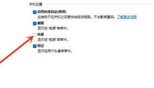 5、在下方勾选“休眠”,再保存之后就可以在电源菜单中显示休眠选项了。