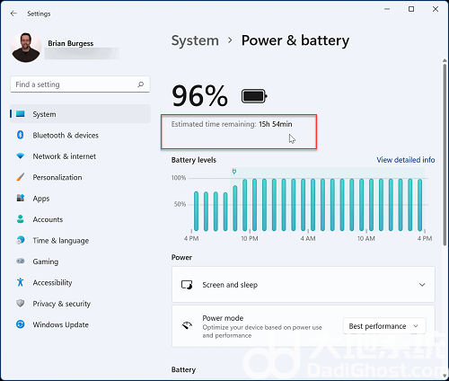 4、在电源和电池菜单顶部,您会在百分比数字下方看到预计剩余时间。这与在早期版本中将鼠标悬停在时钟上时会弹出的信息相同。