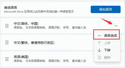 5、进入后,点击“简体中文”右边“三个点”,打开“语言选项”。