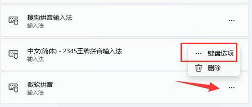 6、再找到“微软拼音”,点击右边“...”,打开“键盘选项”。
