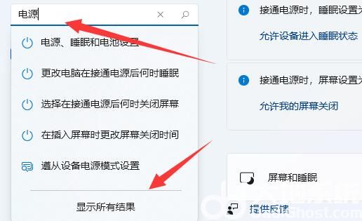 2、点击左上角搜索“电源”,点击“显示所有结果”