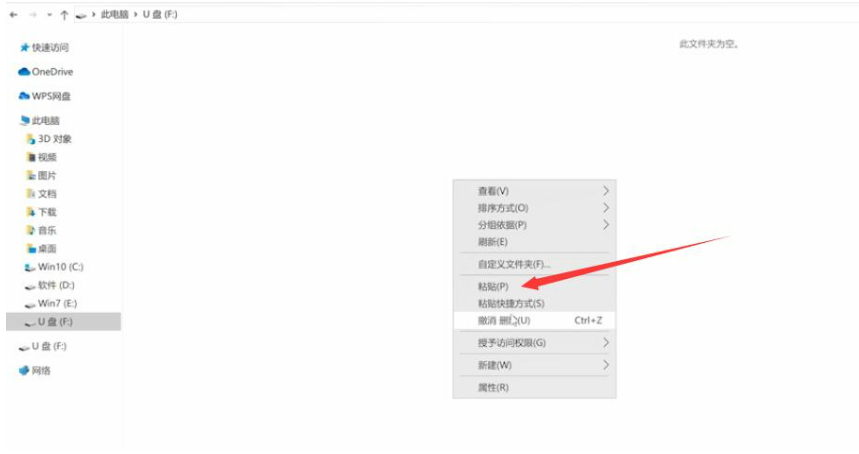 打开此电脑,进入U盘,点击鼠标右键,选择粘贴,等待拷贝完成即可