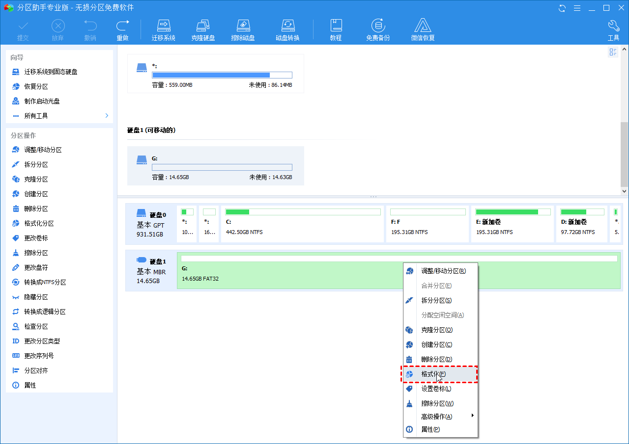 5、傲梅分区助手强制格式化写保护的U盘,如果由于文件系统损坏Windows无法格式化U盘,您可以求助于第三方硬盘格式化软件-傲梅分区助手专业版。它是一款免费的专业软件,拥有友好易于使用的用户界面。因此,当您无法在Windows中将U盘格式化为FAT32或NTFS时,该免费软件可以帮助您修复这个问题。在格式化之前,请提前备份必要的文件,因为数据都将被删除。然后,到下载中心或点击按钮下载傲梅分区助手专业版,安装并启动它。