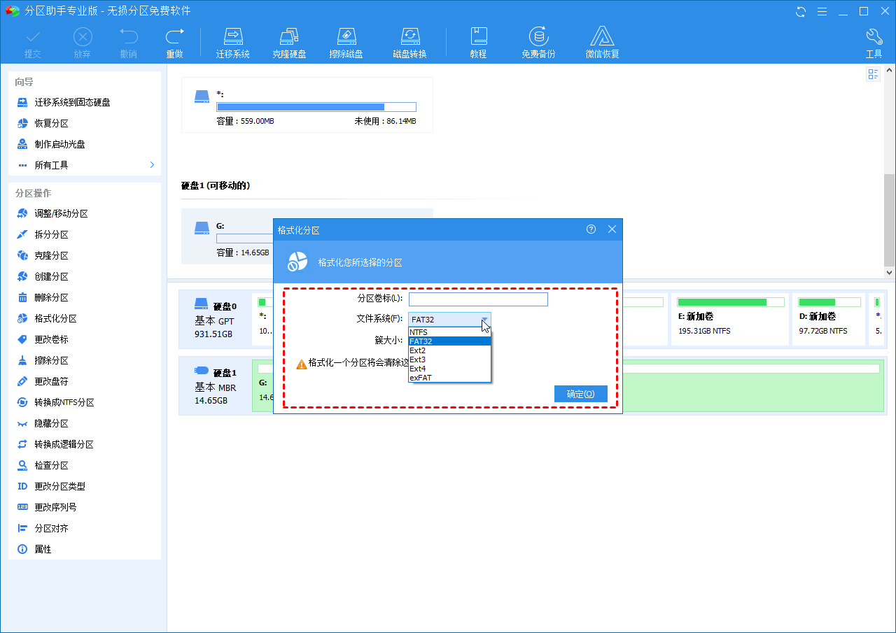 (2) 在弹出的窗口中,选择“FAT32”文件系统。如果需要,您也可以在文件系统下指定“簇大小”。然后,单击“确定”。