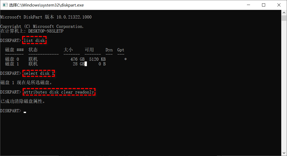 步骤5. 键入“attributes disk clear readonly”,diskpart将更改您的U盘的属性,使其不是只读的。之后,您可以根据需要格式化U盘。