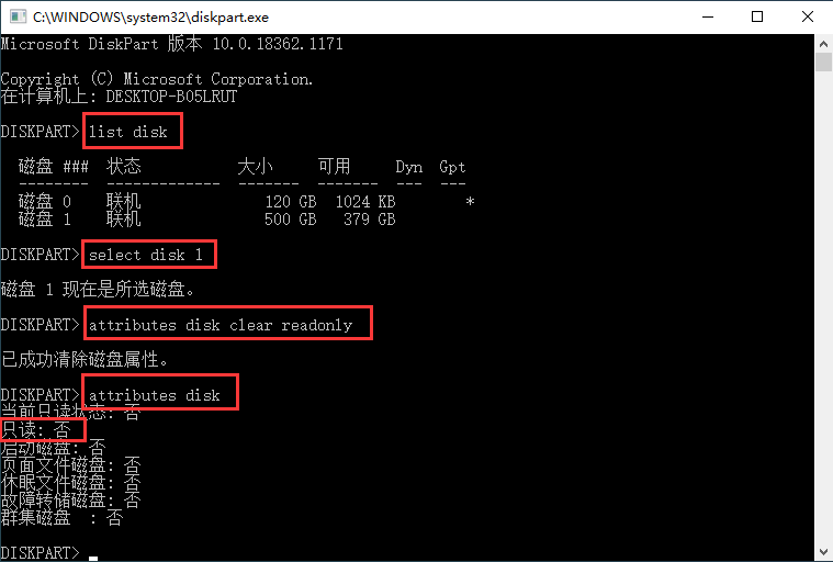 attributes disk clear readonly(清除磁盘属性,解除写保护状态)