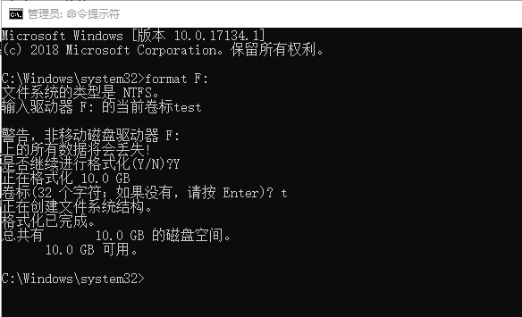 1、通过命令格式化:以管理员身份打开命令提示符,输入format F:(F是需要格式化的分区),回车,根据提示操作,耐心等待一会儿,就可以看到格式化完成啦。