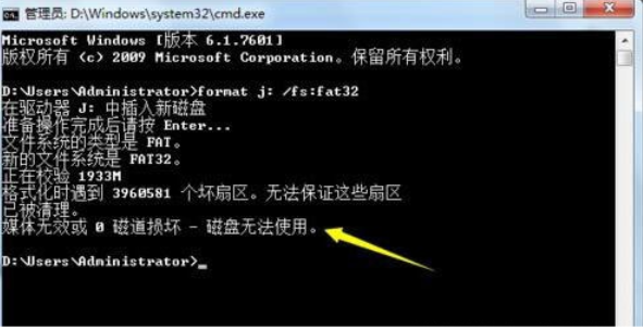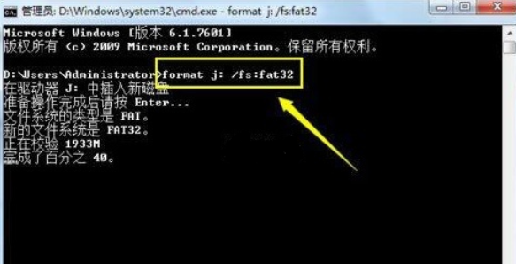 2、接着输入“format j: /fs:fat32”(其中j代表U盘所在盘符)并按回车键执行U盘格式化操作。